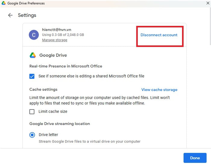 – Bước 2: Trong phần cài đặt, bạn sẽ thấy tùy chọn Disconnect account. Bạn hãy nhấn vào tùy chọn này để ngừng đồng bộ Google Drive với máy tính.