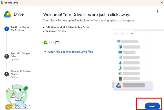 Khi thực hiện xong, bạn chỉ cần tiến hành chọn vào mục Next và kiểm tra xem các file Google Drive đã đồng bộ trên máy tính hoàn tất hay chưa.