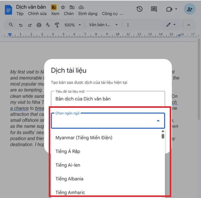 Ví dụ, nếu bạn đang dịch từ tiếng Anh sang tiếng Việt, chỉ cần chọn Tiếng Việt (Vietnamese) trong danh sách ngôn ngữ.
