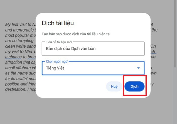 – Bước 4: Sau khi nhấn nút Dịch (Translate), Google Docs sẽ tự động tạo ra một tài liệu mới chứa toàn bộ nội dung đã được dịch. File gốc vẫn được giữ nguyên, giúp bạn dễ dàng đối chiếu hai phiên bản khi cần. Toàn bộ tiêu đề, đoạn văn, danh sách, bảng biểu và hình ảnh cơ bản đều được giữ lại đúng vị trí.