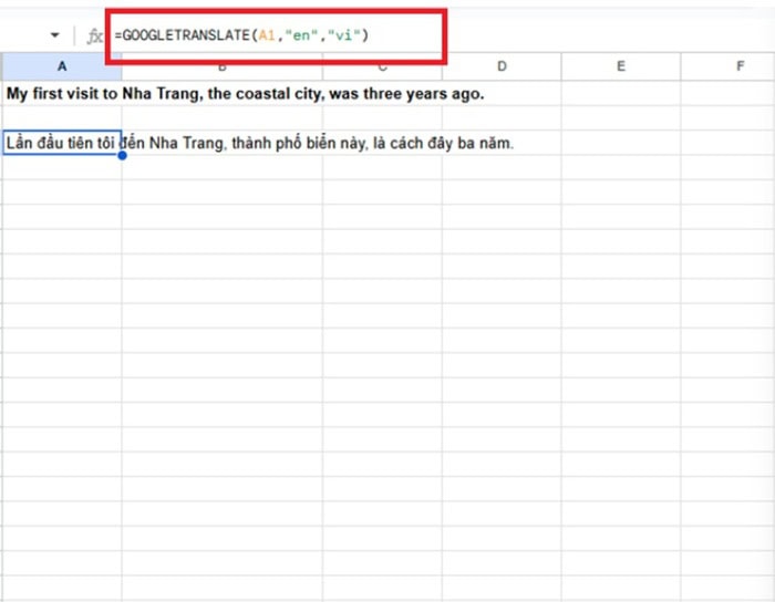 Ví dụ: =GOOGLETRANSLATE(A1;”en”;”vi”) để dịch từ tiếng Anh sang tiếng Việt.