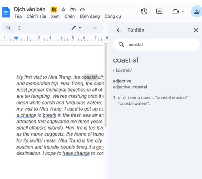 Tại đây, Google Docs sẽ cung cấp nghĩa của từ, từ loại (danh từ, động từ…), cách phát âm và ví dụ minh họa. Tính năng này đặc biệt hữu ích khi bạn đọc tài liệu tiếng nước ngoài và chỉ cần hiểu nhanh một vài thuật ngữ mà không cần dùng Google Docs để dịch cả đoạn văn.
