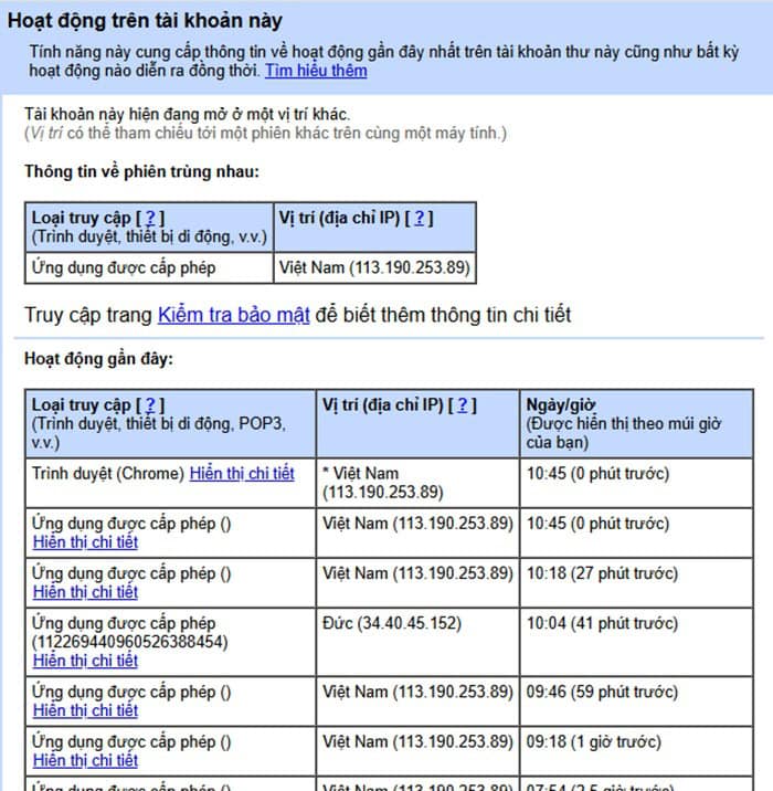 Cửa sổ hiện ra sẽ hiển thị các địa chỉ IP và loại trình duyệt đã truy cập vào email của bạn.