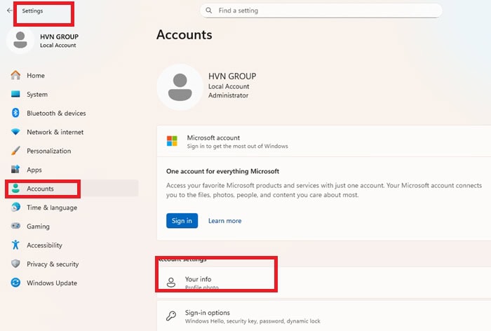 Trên Windows 10/11, bạn vào Start >> chọn Settings >> chọn Accounts >> chọn Your info. Tại đây, email quản trị máy tính sẽ xuất hiện. Đây thường là email quan trọng nhất mà bạn dùng để mua bản quyền phần mềm hoặc lưu trữ dữ liệu.