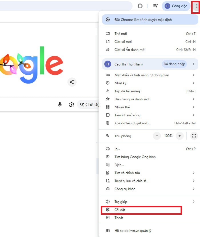– Bước 1: Đầu tiên, bạn cần mở trình duyệt, nhấn vào dấu 3 chấm ở góc trên bên phải và chọn Cài đặt (Settings).