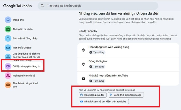 Truy cập vào myaccount.google.com >> tại mục Dữ liệu & quyền riêng tư, chọn Hoạt động của tôi để xem lại lịch sử tìm kiếm, xem YouTube hoặc sử dụng các ứng dụng liên kết.