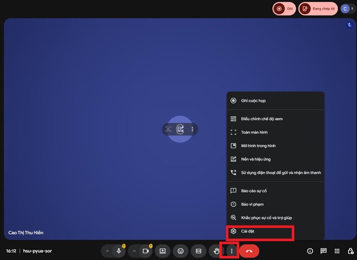 Tại giao diện cuộc họp, nhấn vào biểu tượng Ba dấu chấm thẳng hàng (Tùy chọn khác) ở phía dưới màn hình, sau đó chọn biểu tượng bánh răng Cài đặt.