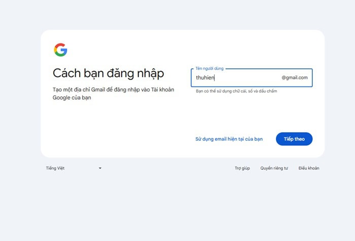 Ví dụ địa chỉ Gmail [email protected].Tên người dùng phải mang tính duy nhất và không được trùng với tài khoản khác. Nếu địa chỉ bạn chọn đã tồn tại, Google sẽ gợi ý các lựa chọn khác.