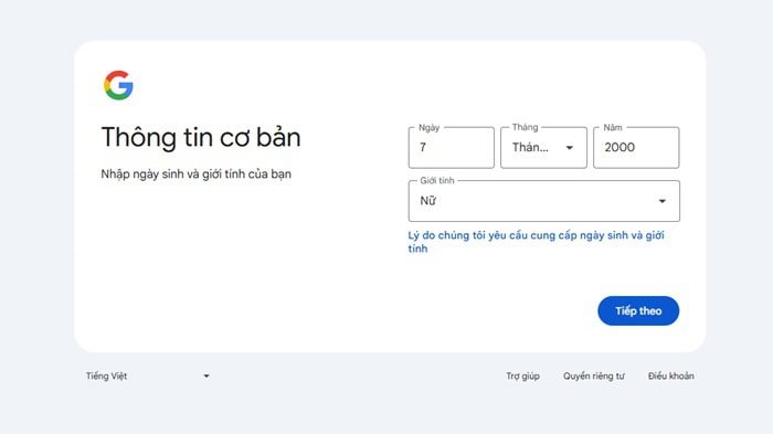 – Bước 2: Google sẽ yêu cầu bạn nhập các thông tin cơ bản như Họ và tên, Tên người dùng (địa chỉ Gmail), mật khẩu.