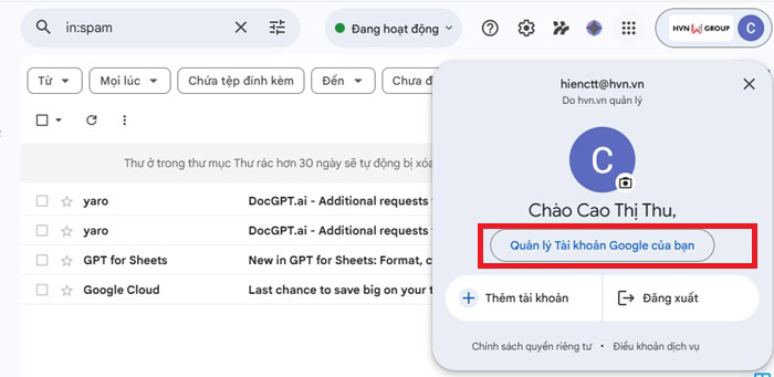 – Bước 1: Đầu tiên, bạn cần đăng nhập vào Gmail của bạn, nhấn vào ảnh đại diện ở góc trên bên phải và chọn Quản lý Tài khoản Google của bạn (Manage your Google Account).