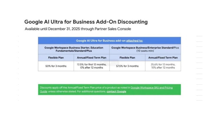Mức ưu đãi này áp dụng khi add ons Google AI Ultra for Business được đính kèm vào các gói Google Workspace Business Starter,  Education Fundamentals/Standard/Plus.