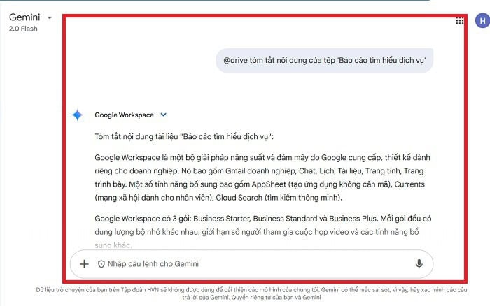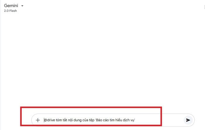 – Bước 1: Đầu tiên, bạn cần mở Gemini trên trình duyệt web và nhập cú pháp @drive kèm theo yêu cầu cụ thể. Ví dụ: @drive tóm tắt nội dung tệp “Báo cáo tìm hiểu dịch vụ”.