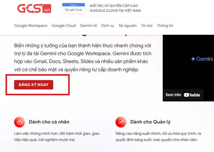– Bước 1: Trước tiên, bạn truy cập vào trang đăng ký Gemini for Google Workspace do GCS Việt Nam cung cấp.