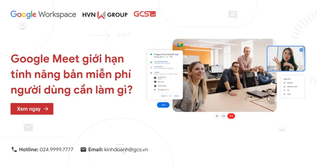 Như vậy, để giải quyết tình trạng Google Meet giới hạn thời gian, giới hạn người dùng và tính năng, hãy nhấc máy lên và gọi ngay tới Hotline: 024.9999.7777 để nhận tư vấn gói dịch vụ phù hợp nhất cho doanh nghiệp. GCS – Đối tác hàng đầu của Google Cloud chuyên cung cấp giải pháp Google Workspace bản quyền uy tín tại Việt Nam.