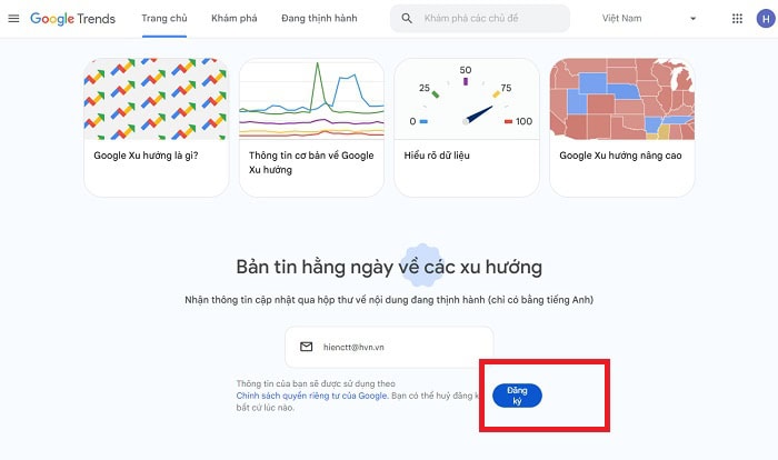 Để cập nhật các xu hướng một cách tự động, bạn có thể thực hiện đăng ký nhận email thông báo từ Google Trends về email bằng cách sau đây.