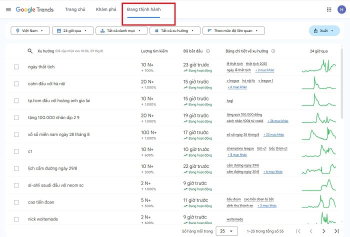 Google Trends có một mục Trending searches (Tìm kiếm thịnh hành) hiển thị những từ khóa và câu chuyện đang được quan tâm nhiều nhất trong 24 giờ qua. Đây chính là nguồn tài nguyên vô giá để bạn nắm bắt những sự kiện, tin tức hoặc chủ đề mới nhất.