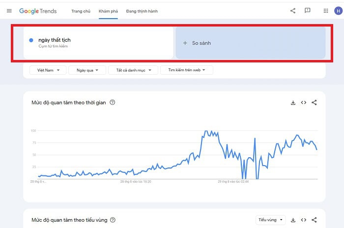 Bạn có thể tra cứu một từ khóa bất kỳ để xem mức độ quan tâm của người dùng theo thời gian như sau: