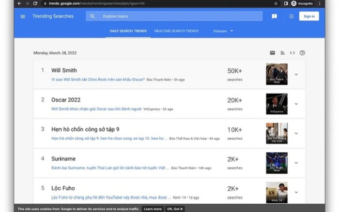 Truy cập vào Google Trends, chọn mục Trending searches và bạn sẽ thấy danh sách các từ khóa đang dẫn đầu xu hướng, cùng với lượng tìm kiếm tăng vọt của chúng. Khi phát hiện một chủ đề đang nóng, đội ngũ Marketing có thể nhanh chóng tạo ra nội dung liên quan trên các nền tảng mạng xã hội, website hoặc blog.