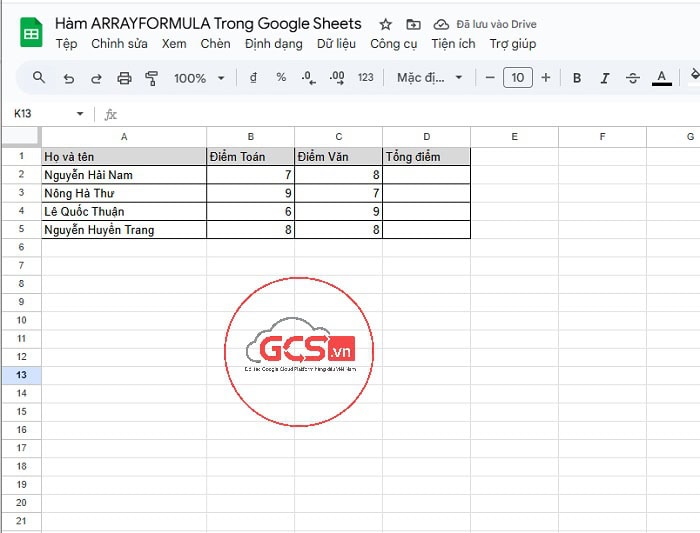 *Ví dụ: Bạn có bảng điểm của học sinh như sau. Bạn cần tính tổng điểm của các học sinh bnao gồm cả điểm Toán và Văn: