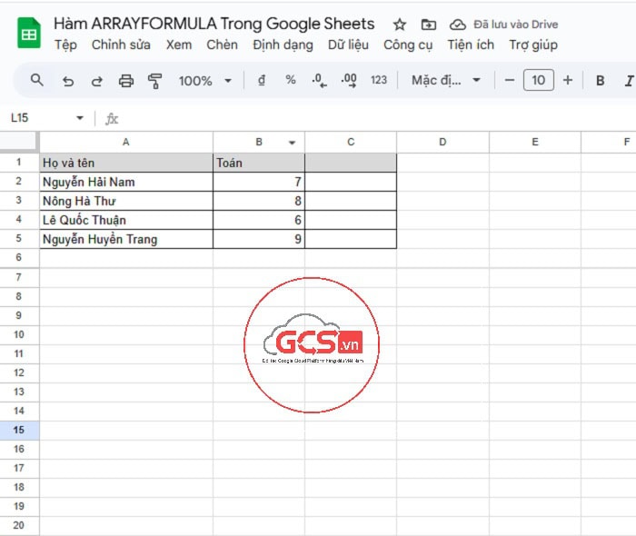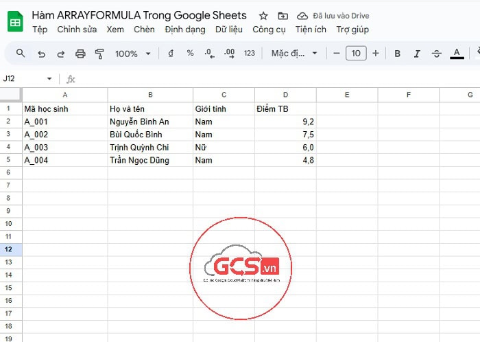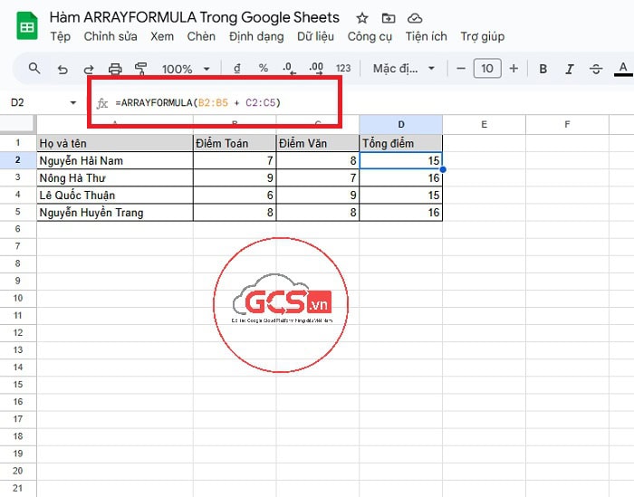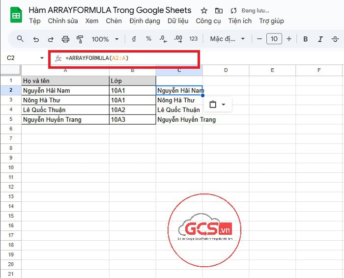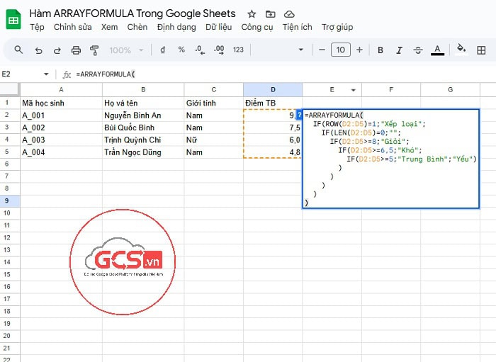 - ARRAYFORMULA(…) : giúp công thức xử lý và trả về kết quả dưới dạng một danh sách nhiều ô (mảng) thay vì một ô duy nhất.
