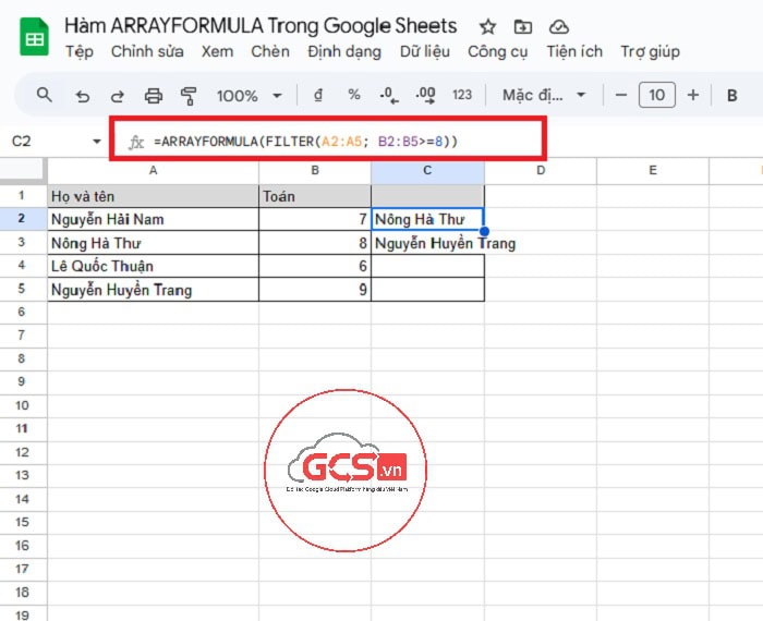- FILTER(A2:A5; B2:B5>=8) : lọc ra những học sinh thỏa điều kiện.