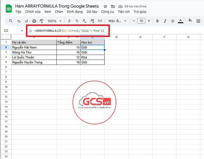 =ARRAYFORMULA(IF(B2:B5>=15;”Giỏi”;”Khá”))