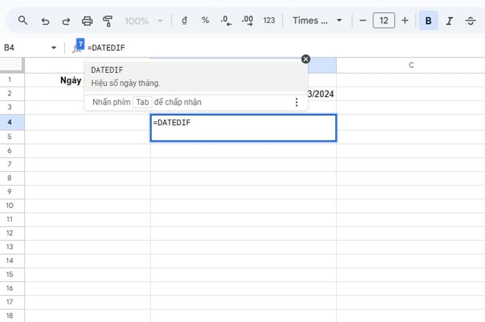 Điểm đặc biệt của hàm này là Google Sheets không hiển thị gợi ý cú pháp khi bạn nhập công thức. Tuy nhiên, nếu bạn nhập đúng cú pháp, hàm DATEDIF trong Google Sheets vẫn hoạt động hoàn toàn bình thường và cho kết quả rất chính xác.
