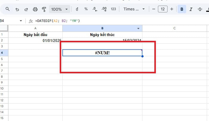 Lỗi #NUM! là lỗi xuất hiện nhiều nhất khi người mới bắt đầu sử dụng hàm DATEDIF trong Google Sheets. Khi gặp lỗi này, công thức vẫn đúng cú pháp nhưng Google Sheets không thể trả về kết quả.