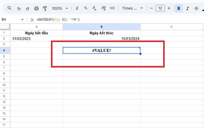 Lỗi #VALUE! xảy ra khi Google Sheets không nhận diện được một hoặc cả hai tham số ngày tháng trong hàm DATEDIF.