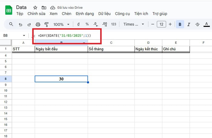 Lấy ngày cuối cùng của tháng trước (31/03/2025) và cộng thêm 1 tháng. EDATE sẽ tự điều chỉnh về ngày cuối tháng đích (04/2025). Sau đó dùng hàm DAY để trích xuất số ngày.