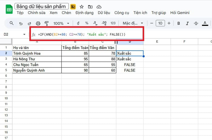 - Nếu bất kỳ điều kiện nào sai, kết quả trả về là FALSE() trả về giá trị logic FALSE. Khi có giá trị FALSE, bạn hiểu là “không đạt tiêu chí xuất sắc” (ít nhất một trong hai điều kiện không thỏa).