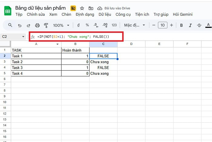 - NOT(B2=1) tức đảo lại: nếu B2≠1 (tức chưa làm) thì điều kiện TRUE, kết quả trả về “Chưa xong”.