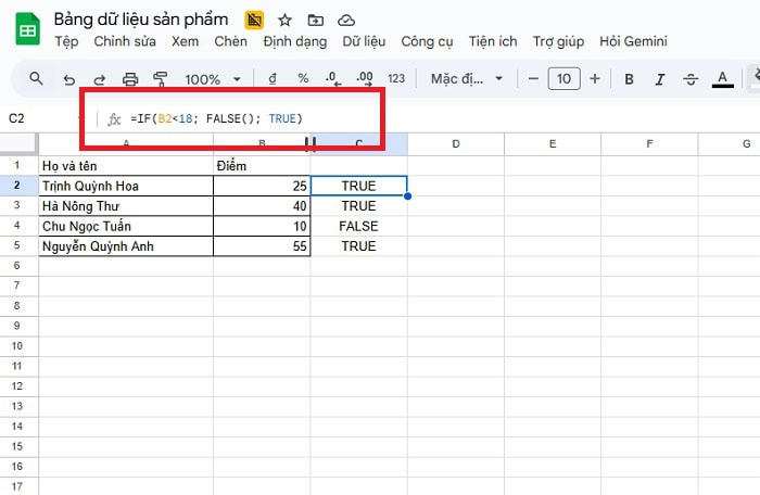 Trong cột B là tuổi người dùng nhập. Yêu cầu, nếu tuổi nhập < 18 thì không hợp lệ trả về FALSE; còn ≥18 thì trả về TRUE (hoặc chỉ cho phép). Bạn muốn tạo cột C kiểm tra điều này.