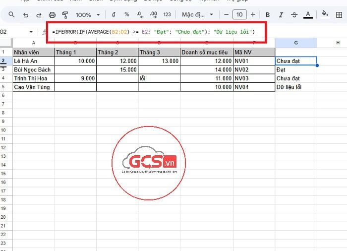 =IFERROR(IF(AVERAGE(B2:D2) >= E2; “Đạt”; “Chưa đạt”); “Dữ liệu lỗi”)