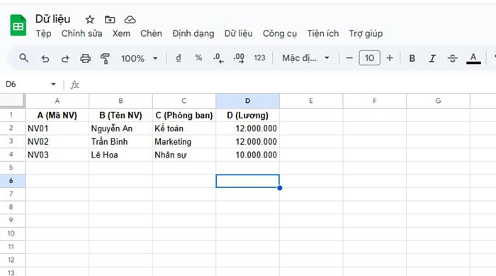 Ví dụ, bạn có bảng dữ liệu tên Data như sau: