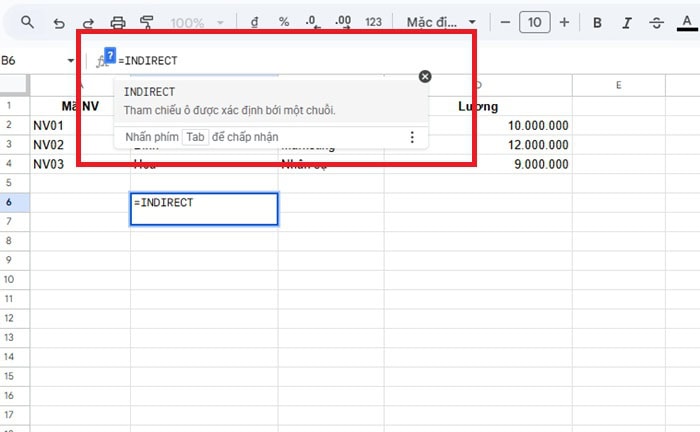 - Nếu dùng chuỗi văn bản, hãy đặt trong dấu ngoặc kép, ví dụ =INDIRECT(“Luong”)