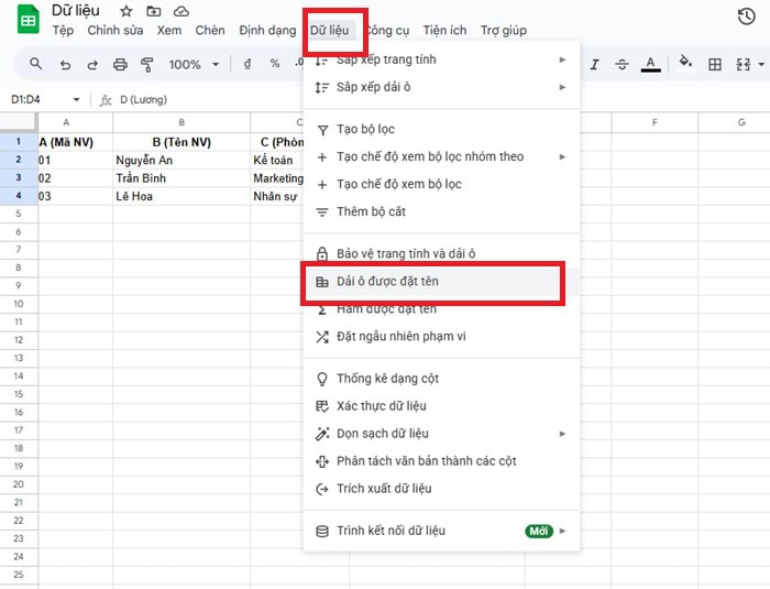 Bôi đen cột Lương >> chọn Dữ liệu >> nhấp vào mục Dải ô được đặt tên.
