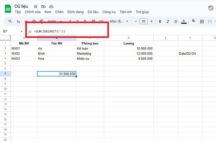 Đây là cách dùng cơ bản nhất của hàm INDIRECT trong Google Sheets. Bạn không tham chiếu trực tiếp đến vùng dữ liệu, mà để địa chỉ vùng đó nằm trong một ô khác. Khi thay đổi ô này, công thức sẽ tự cập nhật theo.