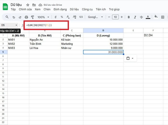 - Ô F1 nhập địa chỉ vùng dữ liệu cần tính tổng lương là D2:D4