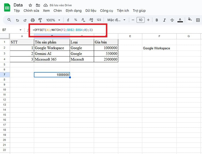 • MATCH(F2, $B$2:$B$4, 0): Tìm “Google Workspace” trong dải B2:B4. Google Workspace ở vị trí thứ 1. Kết quả trả về là 1.