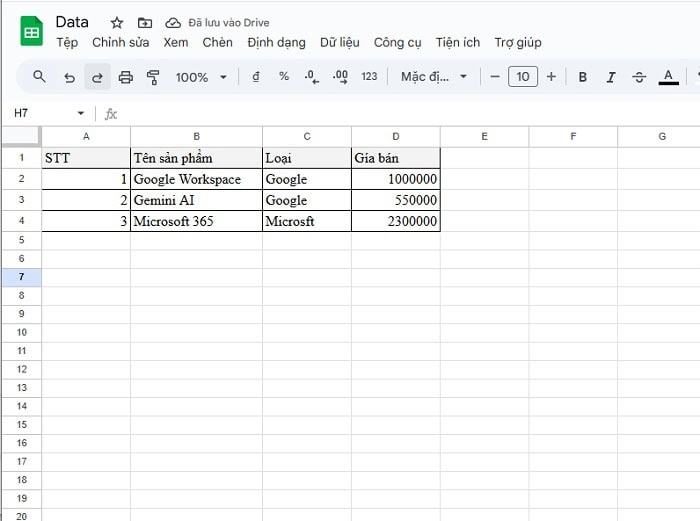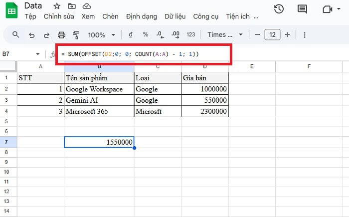 Giả sử với bảng dữ liệu trên, bạn muốn tính tổng Giá bán của tất cả các sản phẩm. Bạn có thể dùng dải cố định D2:D4, nhưng nếu số lượng sản phẩm tăng lên, bạn cần một dải động.