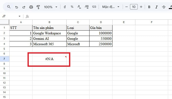 • Lỗi #N/A: Xảy ra khi hàm không tìm thấy giá trị cần tìm trong dải ô đã chỉ định.