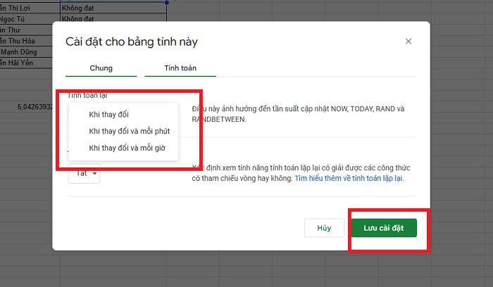 - “Khi thay đổi và mỗi giờ” (On change and every hour): Phù hợp cho các bảng tính lớn, nơi việc tính toán lại liên tục có thể gây chậm hệ thống.