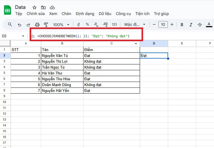 - Nếu RANDBETWEEN trả về 2 trả CHOOSE trả về “Không đạt”.