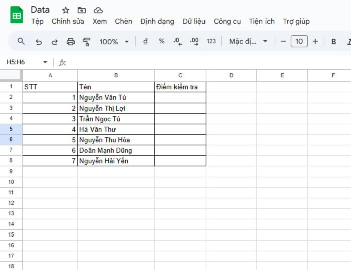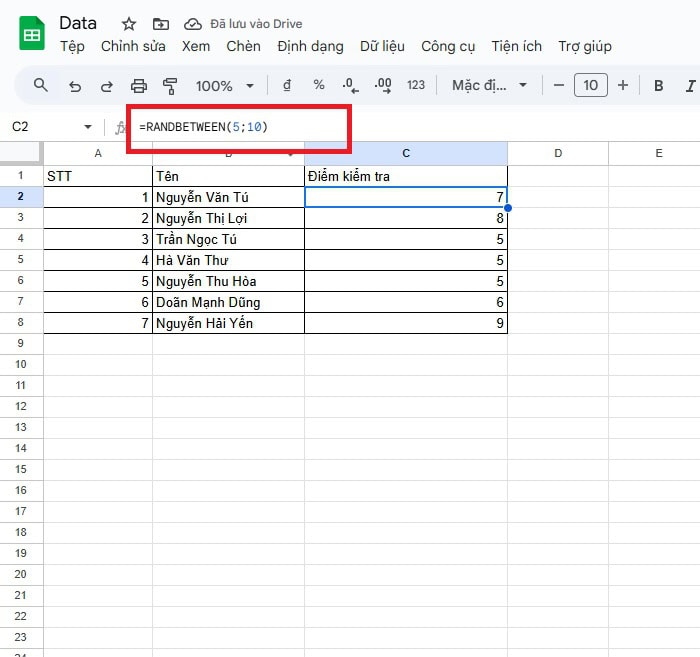 *Yêu cầu: Bạn là giáo viên và muốn tạo nhanh điểm kiểm tra ngẫu nhiên cho danh sách 5 học sinh, trong khoảng từ 5 đến 10 (thang điểm 10). Thay vì nhập thủ công, bạn sẽ dùng hàm RANDBETWEEN trong Google Sheets để sinh điểm ngẫu nhiên cho từng học sinh.