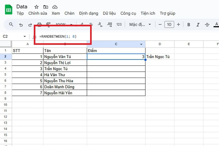 - Ô C1 (Số trúng thưởng): =RANDBETWEEN(1; 8)