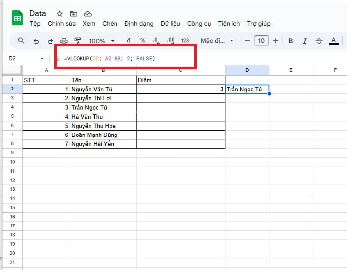 - Ô D1 (Tên người trúng): =VLOOKUP(C2; A2:B8; 2; FALSE)