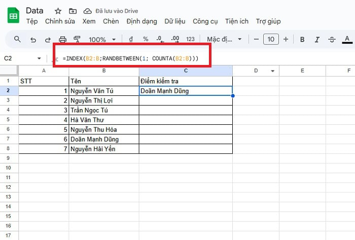 - COUNTA(B2:B): Đếm số lượng tên trong danh sách (Giả sử danh sách bắt đầu từ B2). Đây là giá trị cao của RANDBETWEEN.