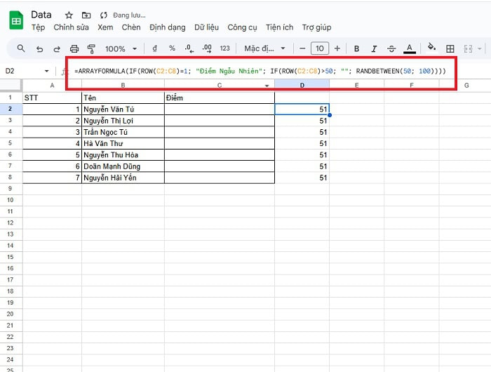 =ARRAYFORMULA(IF(ROW(C2:C8)=1; “Điểm Ngẫu Nhiên”; IF(ROW(C2:C8)>50; “”; RANDBETWEEN(50; 100))))