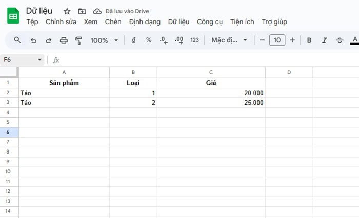 *Yêu cầu:  Lấy giá của Táo – Loại 1.